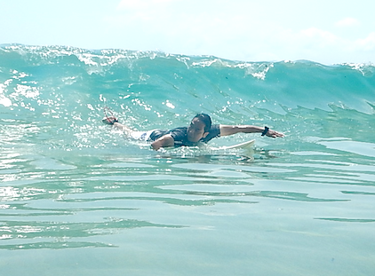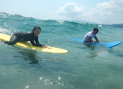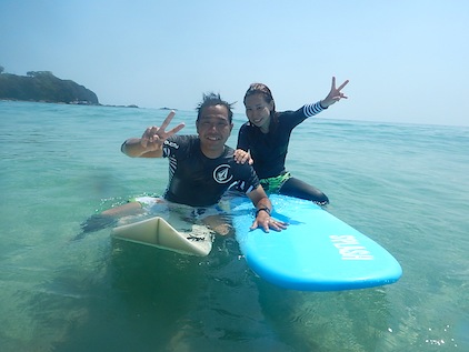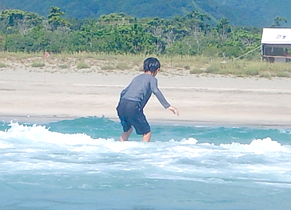 タイミングを合わせづらい干潮時の波に苦戦しましたが、波に乗りやすいポジションを徐々におぼえていかれました。テイクオフの陸トレをまた次回のスクールまで続けておいてくださいね。