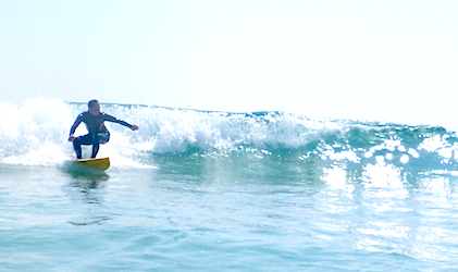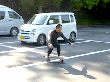 スケートボードを上手く乗るのではなく、海で上手くターンする為の重心の乗せ方とボードの傾け方を体に覚えさせるトレーニングです。
