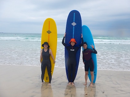 今日は初サーフィンのMさん、Kさんと、サーフィンはやったことがあるけどまだテイクオフした事がないSさんのスクールでした!