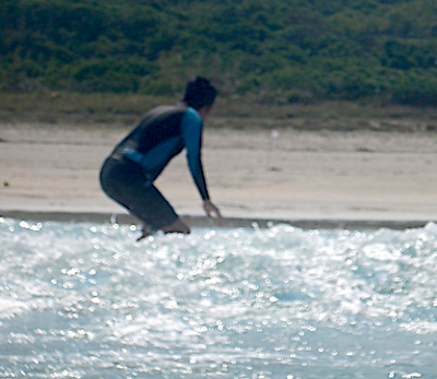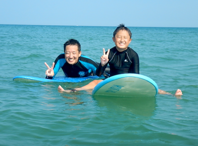 毎年来ていただいているKさん親子。お父さんは年に1、2回のサーフィンの中で少しづつコツを掴み自力で波に乗ります!