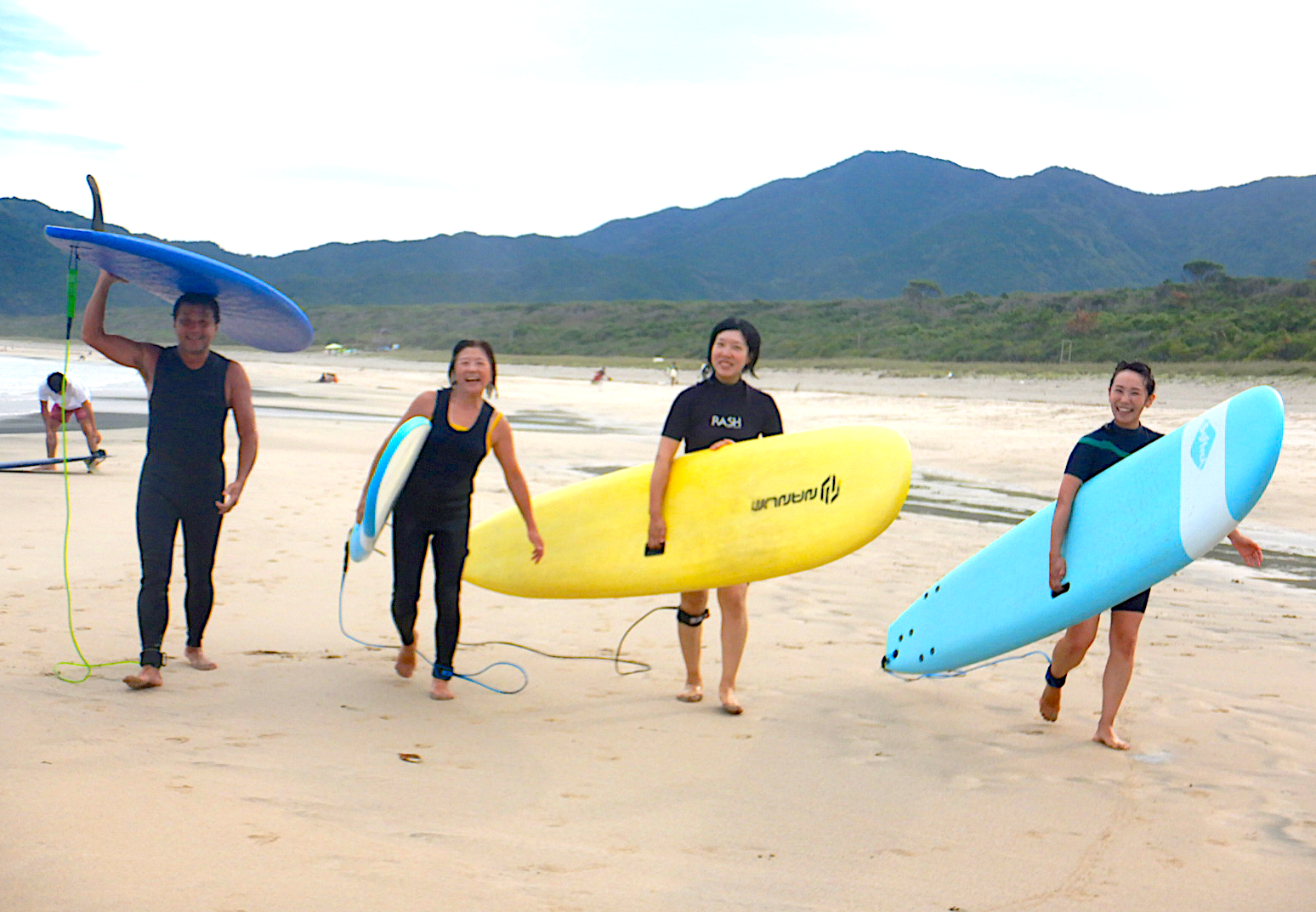 初めてのサーフィンを楽しみにしてこられたKさん&Sさん、年に数回レッスンに参加してくれているKさん、そして本格的にサーフィンを初めて2年、これからのレベルアップのために参加いただいたMさん。