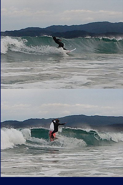 ブランクからの復活!テイクオフの遅れで以前のショートボードで苦戦していた40over Sさんに乗ってもらった右の写真のベーグルエアー。テイクオフの早さからいきなり若かれし頃の動きをとりもどし、オーダーする事に決定!