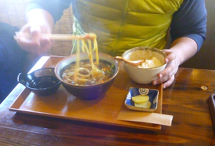 まずは牛すじカレーのだし汁をうどんにからませ、いただきます