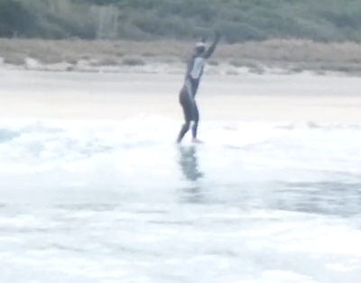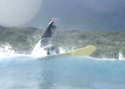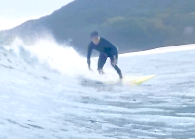 パドリングでの一瞬の失速を修正し、最後のライディングでは、アウトサイドからショアブレイクまできっちりロングライド!!