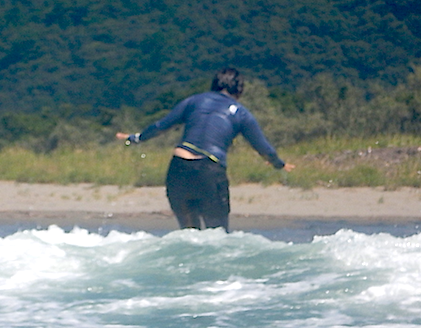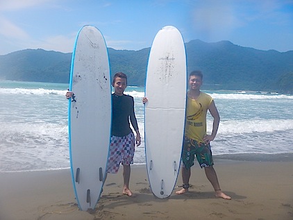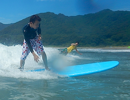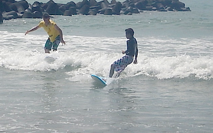 時より入る台風スウェルにやっつけられながら、波を選んでトライしてもらうハードコンデション。そんな中体力を奪われながらもテイクオフできるようになったKさん。