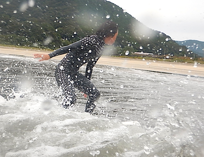進むパドルから波を掴むまでの動作、意識を繰り返し繰り返し練習! 吸収が早いKさん、この短時間の中で練習した動きが形になってきました!! そして後半、今回練習した動きを意識してのテイクオフ!!!