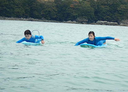 サーフィンが大好きで海に通う大人たち、初めてサーフィンする子供たち。