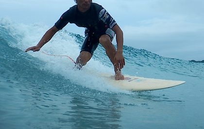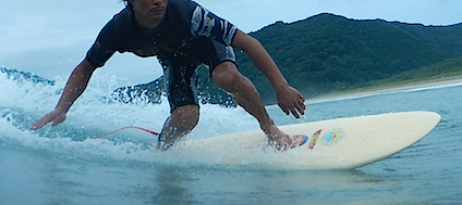 海での実践!難しいシングルフィンに乗ってもらい、アドバイスを入れながらのたった3本のライディングでイメージの動きをつかむ!思わず「天才!」と言ったライディング!ポテンシャル高い