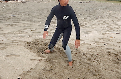 我流でサーフィンを続けて来たというIさん。陸上で、重心と軸、ターンを効率よく決められる体勢作り!をやっていただきました。