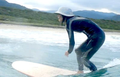 少しアドバイスを入れながら感覚を掴んでくると、うまくテイクオフし、波の斜面でボードをコントロールしていった!