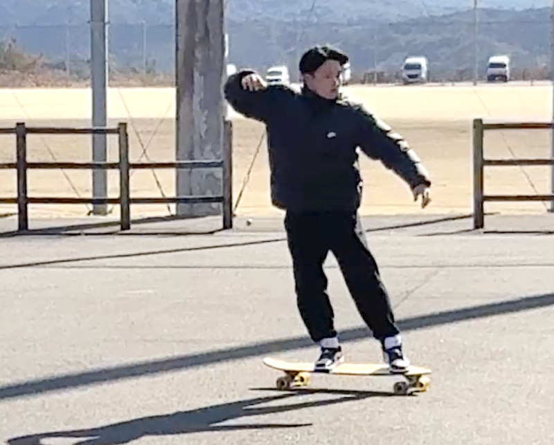 前回と違って自信を持って スケートボードを蹴り出し、しっかりと体重を乗せて ターンに入れています!