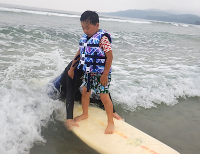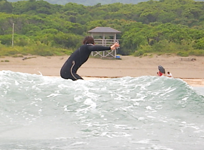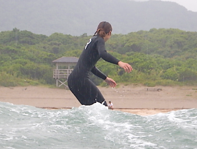 今回参加できなかっらMさん。レッスン終了後、お子さんを見てもらいながら波にトライ!!
