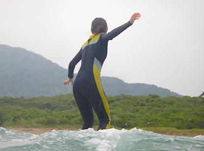 Mさんママはレンタルボードでお子さんと楽しみながら波と戯れます。