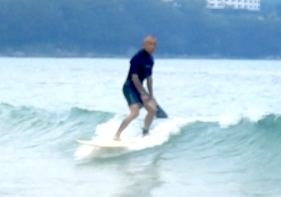 今日はさらにパドリングのフォームを修正。ぶれないパドルが決まってくると、弱くて小さな波 を捉え、早いタイミングで テイクオフすることに成功!!