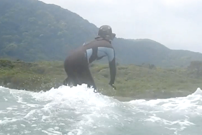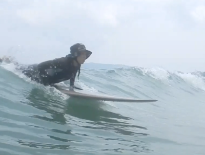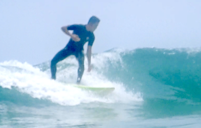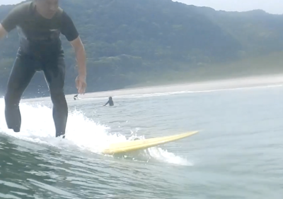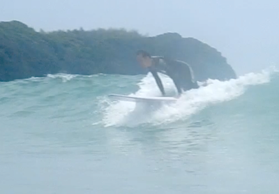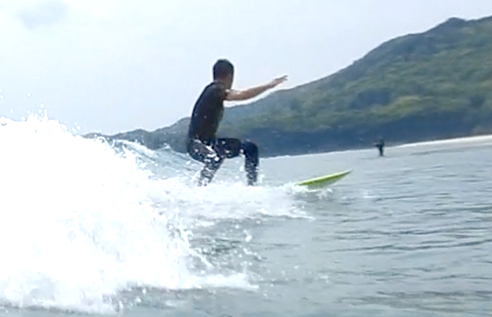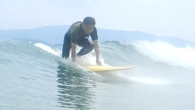 少しずつ波に慣れてきて、後半には波のトップから早いタイミングでのテイクオフを狙い、 しっかりと決めることができましたね!