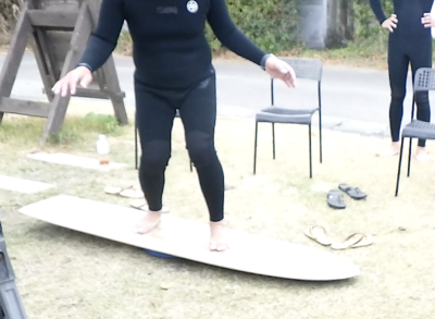 パドリングフォーム、ライディングフォームを陸上で簡単に落とし込むように練習していきます。