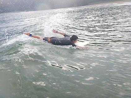 パドルと重心の修正!後半にはうまく漕げていて、やり方によってはこれまでよりも6~7割の力で楽に波に乗れる感じもつかめてきましたね!