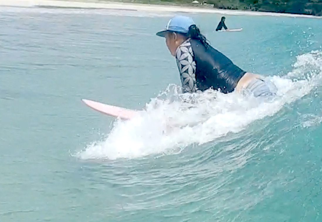 波の斜面を捉えライティングする回数が増えてきたHちゃん。この精度をさらに上げて、ターンや技にもチャレンジしていきたいですね!