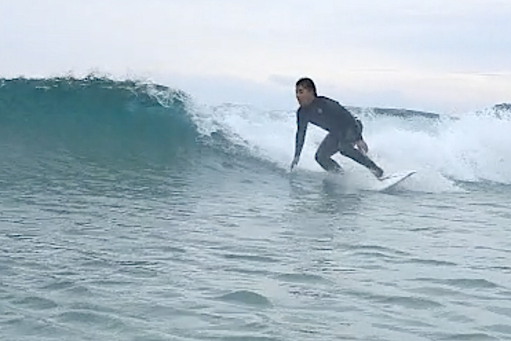 諦めることなく、何度も何度もトライ、徐々に力が抜け、いつもと違う感覚で、波をキャッチし、いつもと違う軽い感覚でテイクオフし、ライディングがスタートできた!