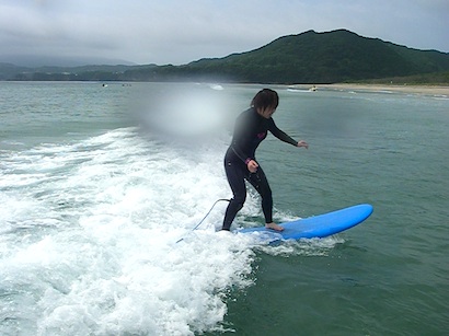初めてサーフィンにトライするIさん、海に入る前少し緊張気味..