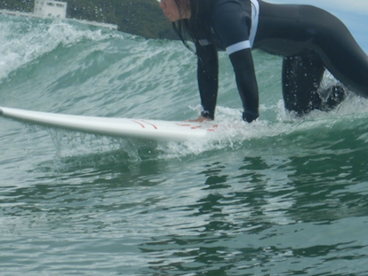 今回の合宿で6’0のベーグルエアーに乗れるようになったMちゃん。小波での基本練習を終え、最終日はこのボードでサイスのある波に挑戦!!