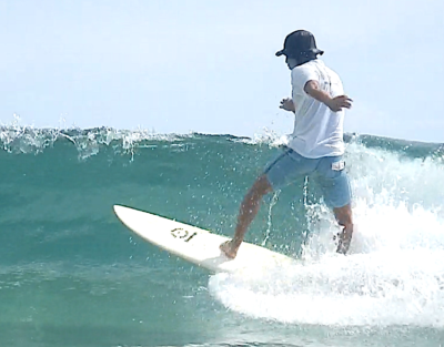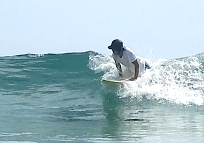 その後うまくいくと、 難しい波でも、スムーズに テイクオフし、 波の斜面を捉えている!