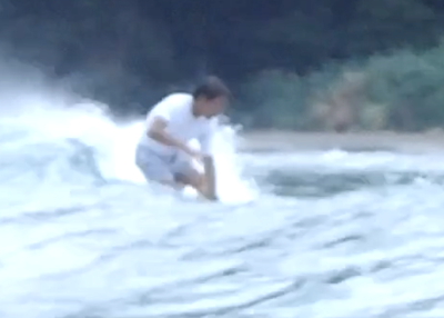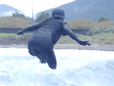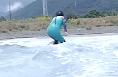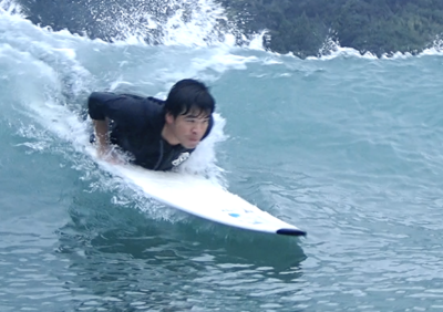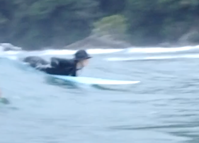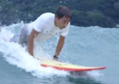 1本うねりからトライし、 急にほれ上がる波の斜面を 滑ることに成功!!