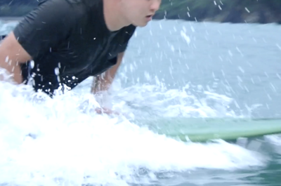 今回のレッスンでは、ブレない基本動作を練習し、変化する難しい波の中、自力でうねりから 波をつかみ クリーンなテイクオフに成功!!