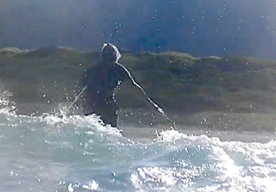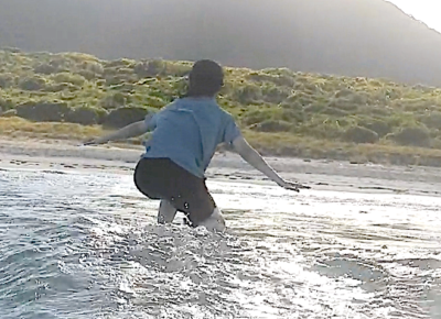 特に、最後の 波では、沖のうねりからテイクオフし、岸の岸まで 乗り継いでいました!