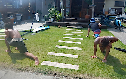 今回オーダースクールのKくん。若くて練習量の多いので、1年後に上手くなったことを想定したボードをイメージ。オーダーいただくボードは今のボードと比べ浮力が落ちる分、波の力を利用したテイクオフを練習が必要。次回のボードに乗る時にすぐに対応できるよう練習していただきました!頑張る