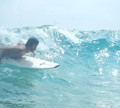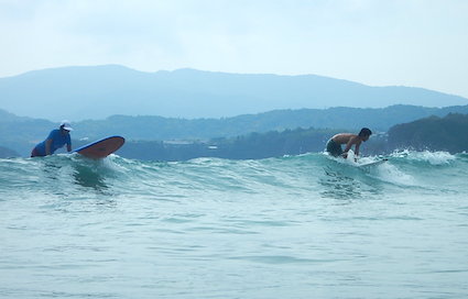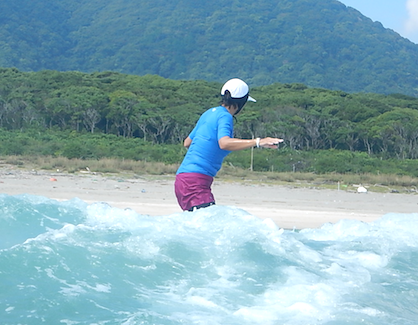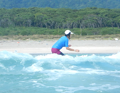 初めてのサーフィンのKさん。すぐに慣れ、すぐに乗れましたね!面白~い!!