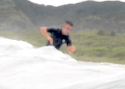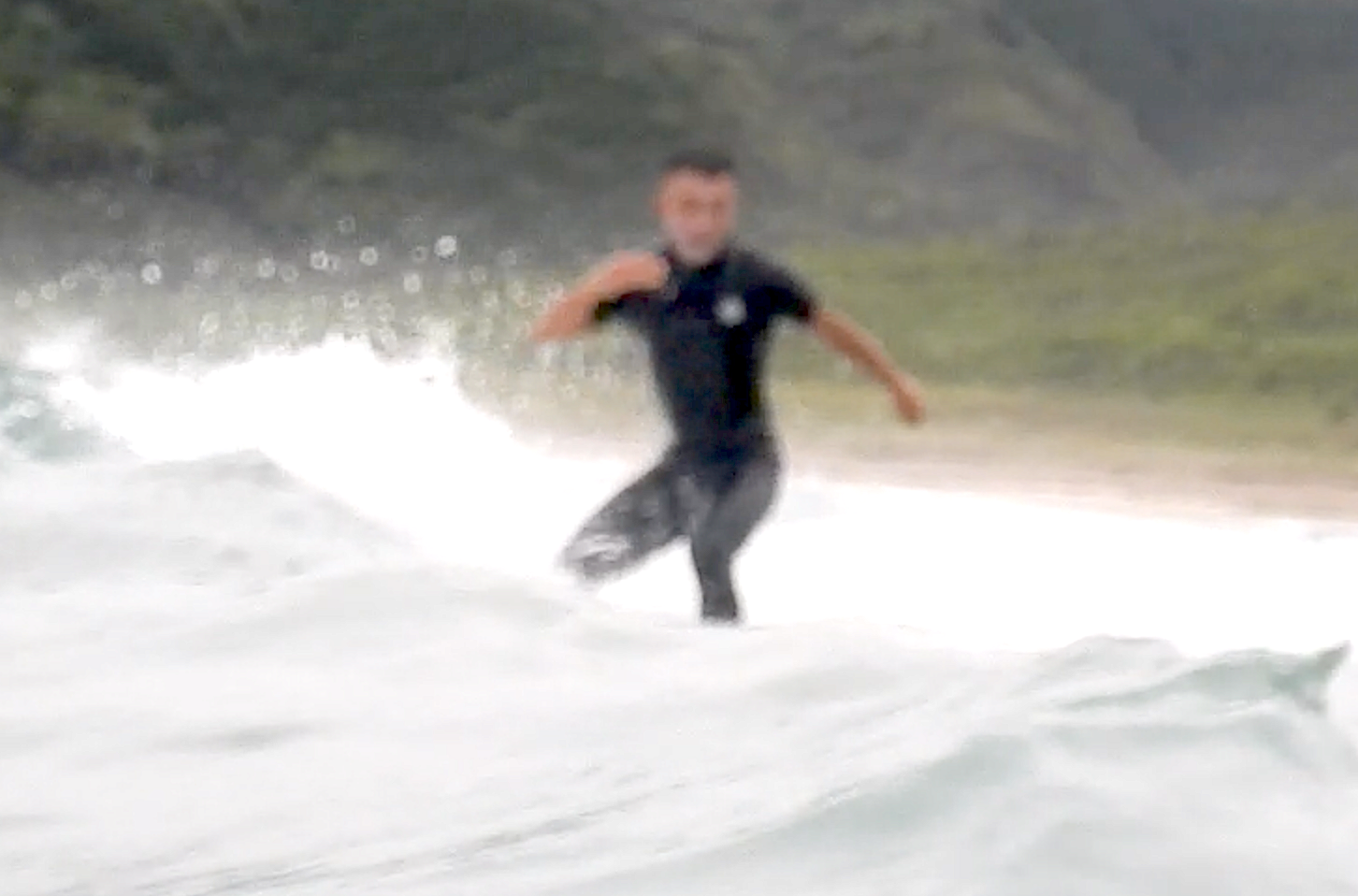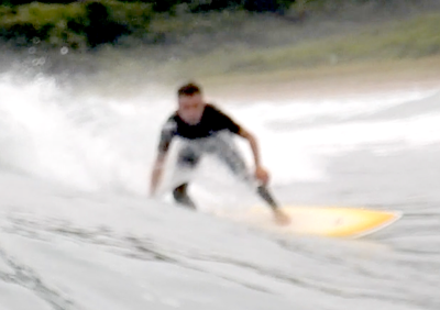 しかし、海の中に入ると、息が止まり、力の入った動きで、 サーフボードを強引にコントロールしているように見える。