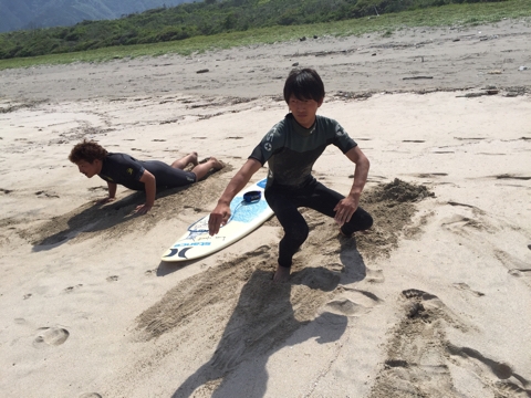実践では若い二人なので吸収力抜群!進むパドリング、加速するテイクオフ!良い感じに出来上がってきましたね!自信を持ってサーフィン楽しんでくださいね!