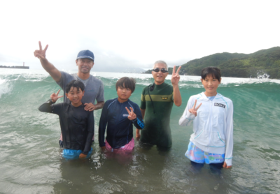 お父さんと一緒にサーフィンの経験がある子どもたちのレッスン。