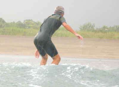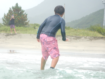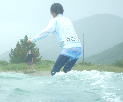 子どもたちと一緒に、昨日に引き続き自分で波に乗るための基本動作を練習したSさん。