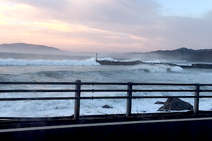 台風通過中!足摺岬の陰に隠れたこのビーチはサーフィン可能。ただいま6名様入水中!(^^)(笑) -