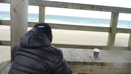 の疲れも見せず朝からビーチへ。海は冷たいオンショア強風と雨。