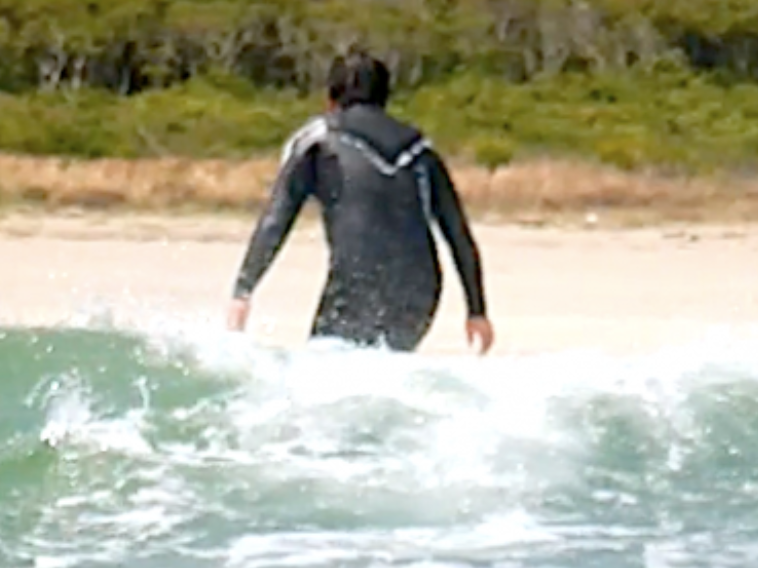 古傷の膝をかばうためにスタンスを変えてもらっての練習。数ヶ月前までレギュラーフッターだったことをご自分でも忘れてしまうほど、当たり前にグーフィースタンスで波に乗っています!!