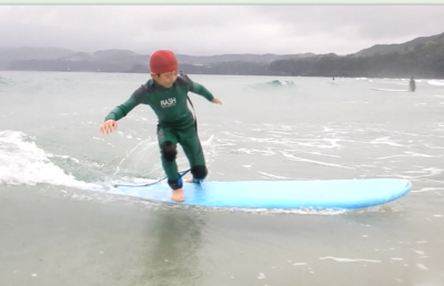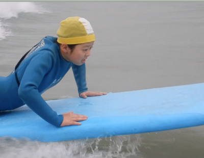 はじめての サーフィンにチャレンジのKくん。