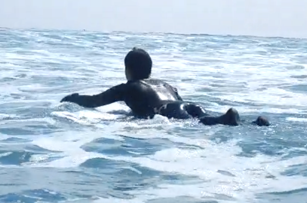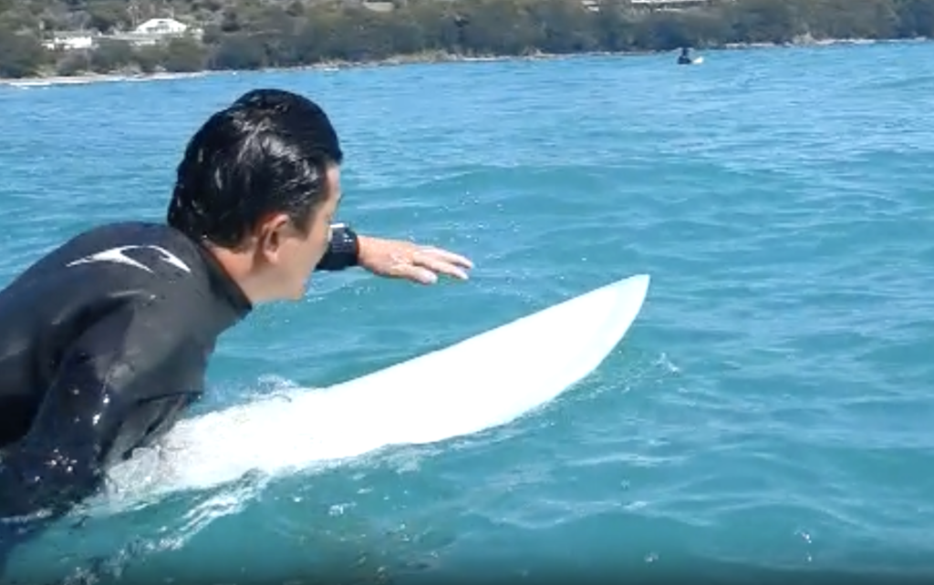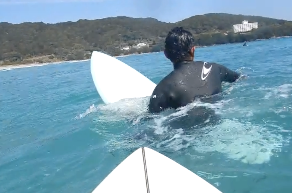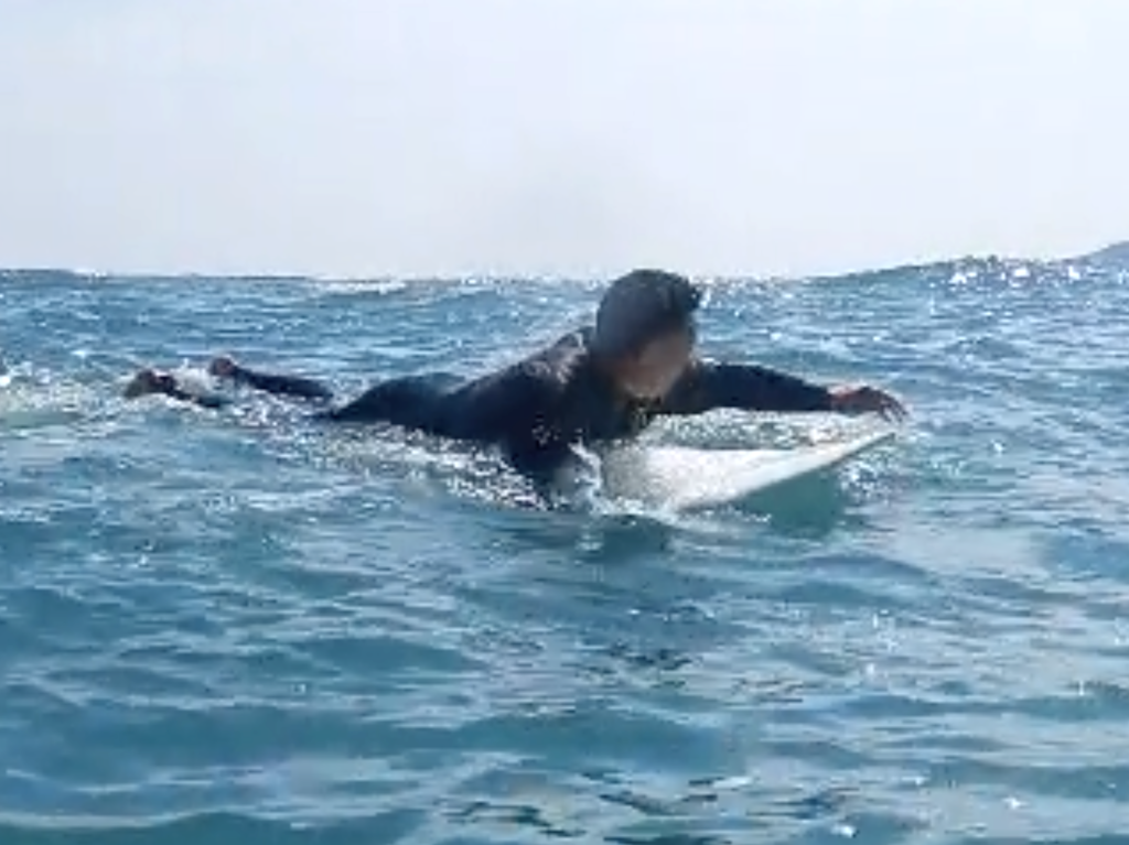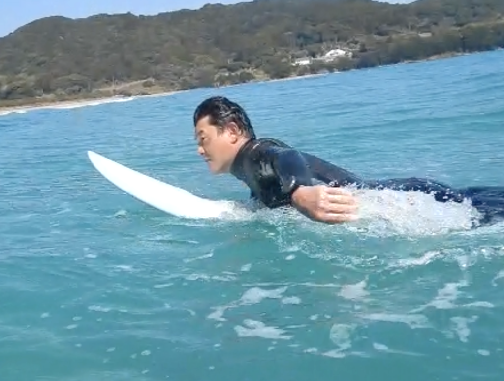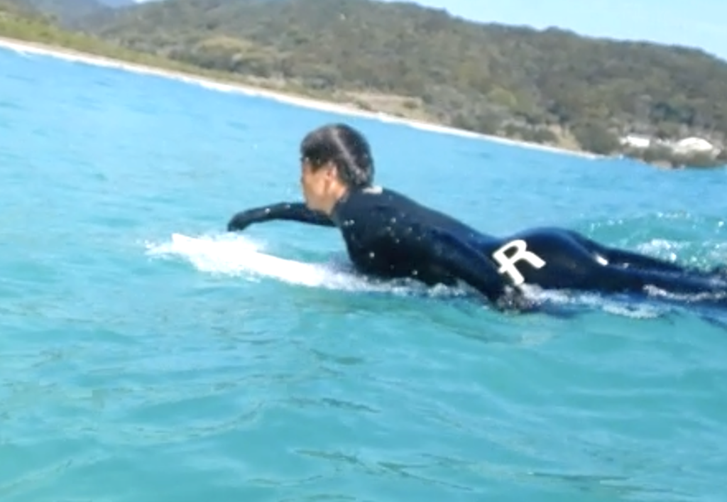 より楽に、よりスムーズにパドリングし、そのまま自然にテイクオフへつなげていく流れを意識して反復練習。