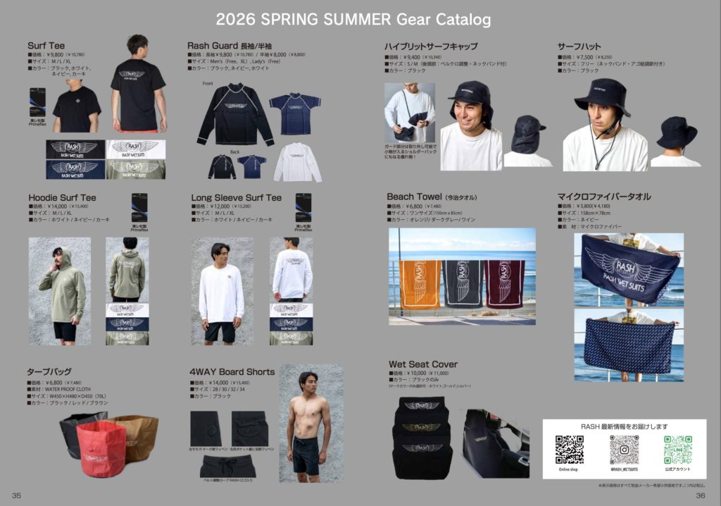ラッシュガード、バスタオル、キャップハットなどのグッズもあります!