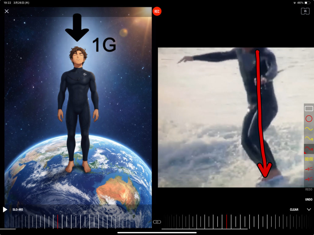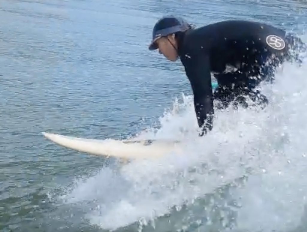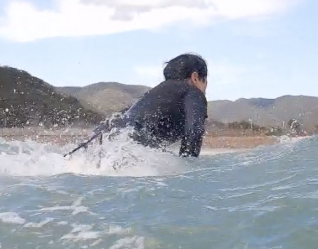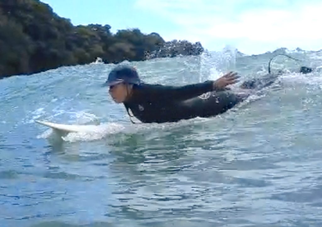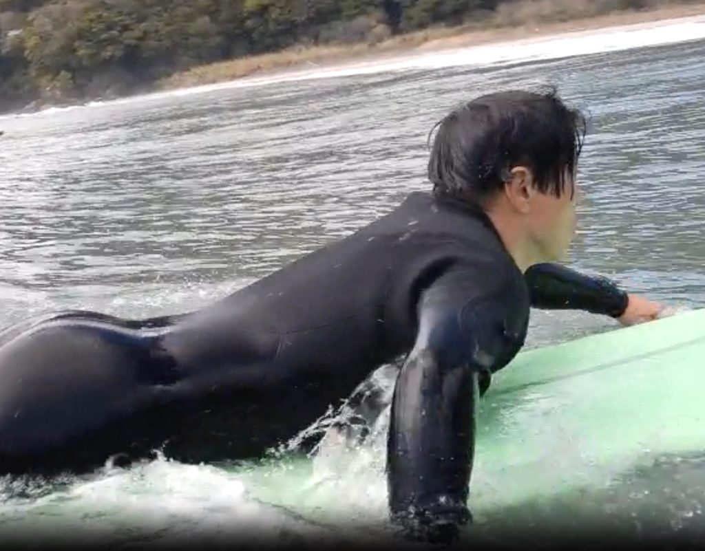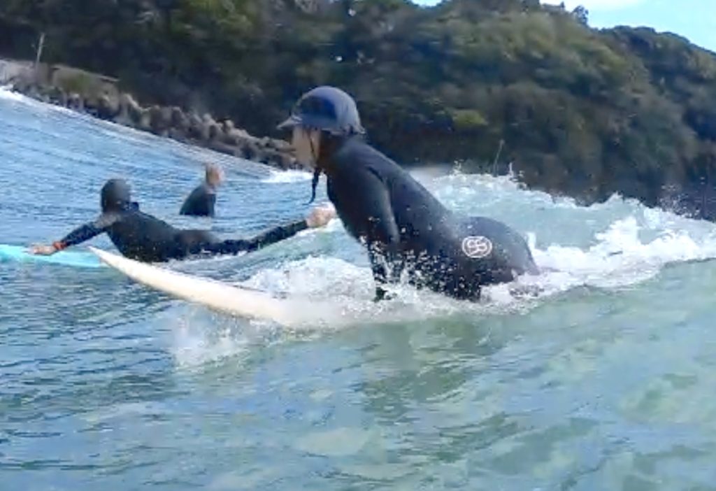 波が掘れていた影響でパーリングはありましたが、波に乗るまでの動作はしっかり仕上がってきています。