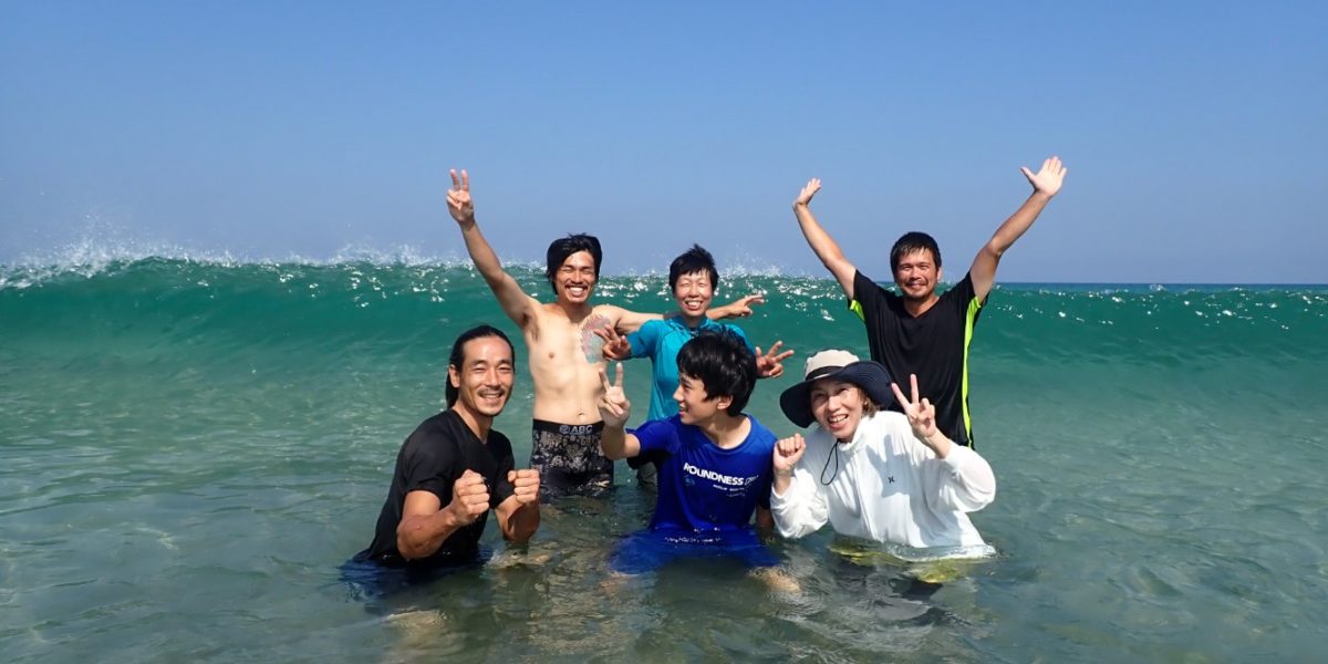 E天才チーム。同じ系列の職場 の仲間で 以前からレッスンに参加してくれています。 本格的にサーフィンをしているわけではなく、 シーズン中 レッスン に通いサーフィンを楽しんでもらえるメンバーです たくさんの 方を これま