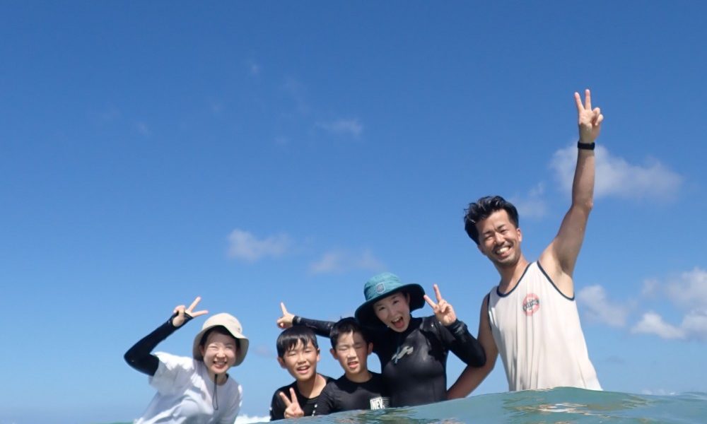 昨年も参加いただいたTさんファミリーと、 キャリア2回目のRちゃんのレッスン。 晴天!! 透明度の高い海!そしてクリーンで 優しい波! レッスンには最高のコンディションでしたね! 昔サーフィンしていたお父さ