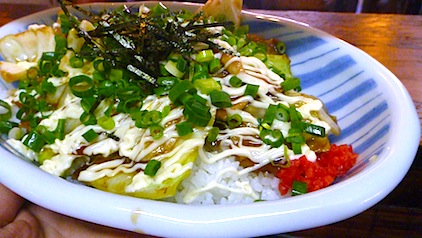 腹ぺこサーファー人気メニュー 豚マヨスタミナ丼 自家製にんにくしょうがだれで焼き上げた豚肉と野菜がごはんに馴染み食欲をそそります -