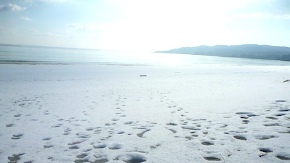 寒~ 朝寒すぎて目覚めました。海に着くとビーチは雪。1年に1度はこんな景色になります。やっぱこんな寒い日はお好み焼きが良く出ました。ふっくらフワフワ&この焦げ目、完璧な焼き具合っす! -