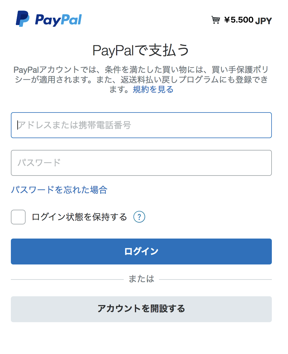 PAYPALアカウントをお持ちの方はログインしてお支払いをお願いいたします。アカウントお持ちでない方は「アカウントを開設する」をクリックしてして登録の方お願いいたします。